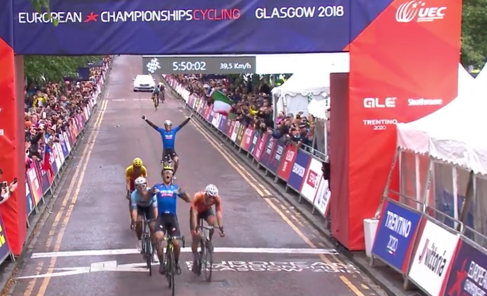 #Glasgow2018 – ¡Victoria de Matteo Trentin! Se cumplieron los pronósticos en el sprint y el italiano es el nuevo campeón de Europa. Van der Poel y Van Aert completan el podio. @jesushl90 termina cuarto. pic.twitter.com/JPK9cuRXPR