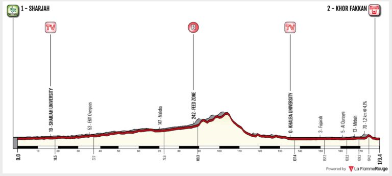 Por David Hunter Sharjah – Khor Fakkan 179.4km Un día para sprinters. Hay un par de cotas en el camino, pero nada preocupante para los velocistas. A 6 km del arribo, los corredores afrontarán una ondulación 1.2km al 4.1%, punto que puede servir a algún interesado en evitar la volata. Dicho eso, no es una trepada … Sigue leyendo UAE Tour 2019 – Previa etapa 5