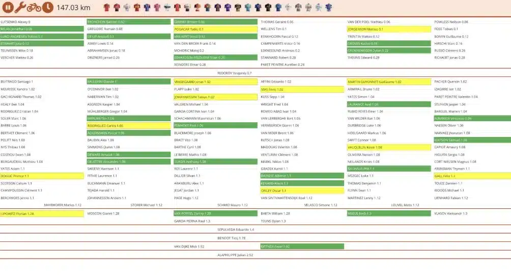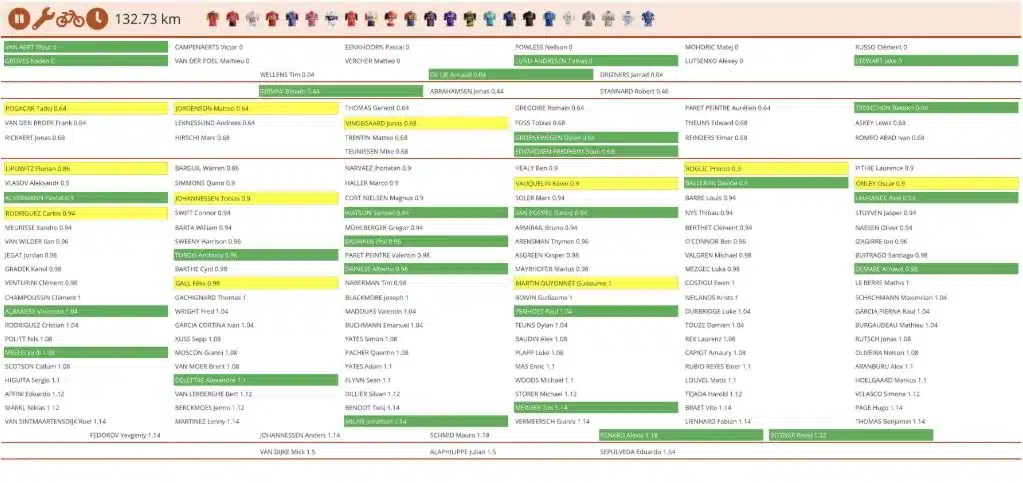 La cuenta de X, Velofacts, publicó en el momento de la carrera diferentes capturas de la posición de los 166 ciclistas que continúan en competencia. Las siguientes tres capturas muestran –congelados- la situación de grupos –basado en GPS- a 150,27 km del final (es decir, apenas después del accidente), 147,03 km y 132,73 km, momento en el cual el pelotón se estaba reagrupando, después de casi 20 kilómetros de persecución.