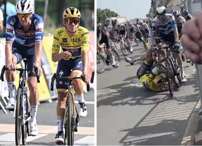 Pero no fue el único infortunio para el Soudal – Quick-Step. Louis Vervaeke, gregario clave de Remco tanto aquí en el Dauphiné como en el próximo Tour de France, sufrió una fuerte caída que le dejó una rotura de clavícula. El video habla por sí sólo.