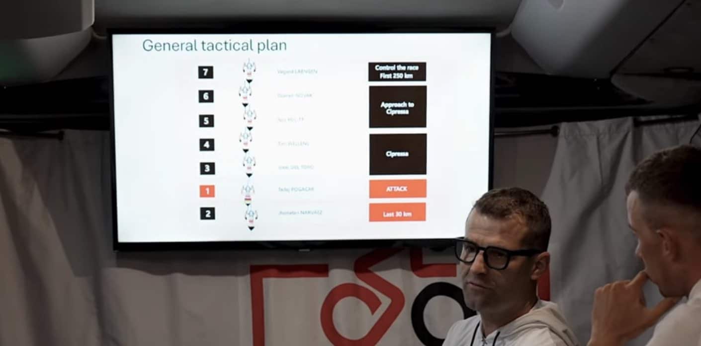 Sin embargo, la imagen muestra otro detalle donde se muestra una falencia del plan. La idea era que Isaac del Toro fuera el último gregario de Pogacar, con Jhonatan Narváez a rueda del esloveno para dejar un hueco al resto del pelotón (3). Estos detalles fueron señalados por Matxin y Gianetti, quienes reconocieron que “correr no es como una PlayStation”.