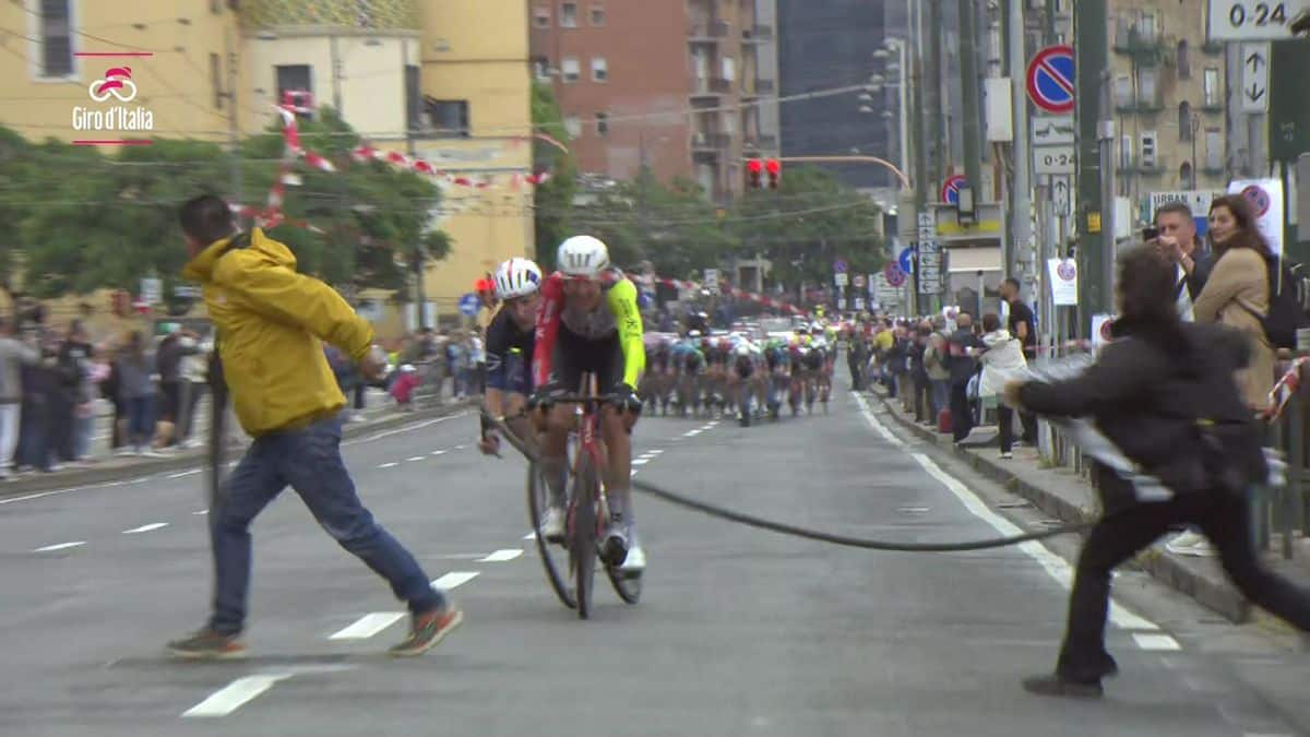 Un momento de gran tensión y nerviosismo se vivió ayear en Nápoles durante el final de la etapa 6 en una jornada que ya estaba caldeada por la caída masiva en el pelotón que provocó el abandono de ciclistas como Jai Hindley.