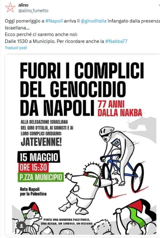 Algunos transeúntes intentaron detener a los dos manifestantes. Cabe mencionar que la organización no tenía a ningún voluntario u oficial de policía para detenerlos, pese a que la protesta ya estaba anunciada en redes sociales. En un post publicado ayer a las 8.51 de la mañana, este usuario de X compartió un afiche: “Fuera los cómplices del genocidio de Nápoles. A la delegación israelí del Giro d´Italia, a los sionistas y a sus cómplices gritamos: jatevenne. 15 mayo, 15:30, Plaza Municipio”. Allí se pide llevar una bandera palestina o un kefiah, elemento este último que muestra el inadaptado a los corredores.