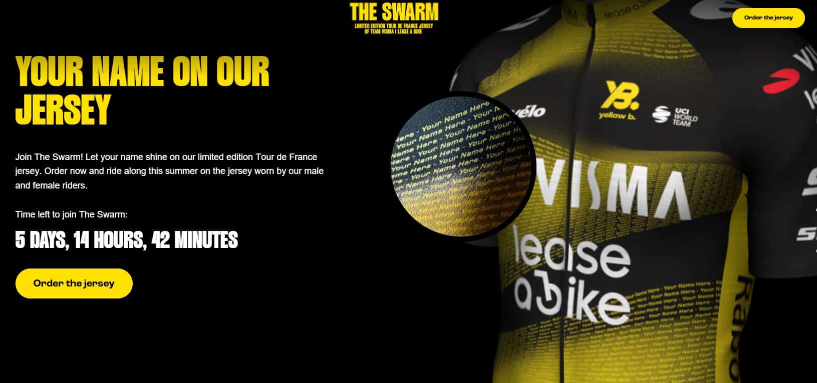 “Con este diseño exclusivo, bautizado como The Swarm (“el ejambre”, se rinde homenaje a la dedicación de sus aficionados y los convierte, literalmente, en parte del equipo del Tour”, escribe el equipo en un comunicado de prensa en su sitio web. Como parte del lanzamiento, quienes adquieran la camiseta en la web de Visma podrán incluir su propio nombre en ella. Precisamente característica especial es que cada uno de los integrantes del equipo del Tour –como Vingegaard y Wout van Aert- usarán camisetas sutilmente diferentes con diferentes nombres de aficionados inscriptos en ellas. La condición para ellos es que reserven su compra entre hoy y el 30 de abril.