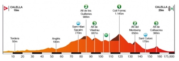 The hardest climb is Coll Formic, 9.3km at 5%, with a maximum of 9%. There is still 45km remaining, but it should be too tough for quite a few riders. Once the riders descend the mountain, they tackle Alt del Montseny. It is 2.7km at 7%, with a maximum of 9%. There is a small valley in-between the last two climbs, that will discourage any serious attacks. The final climb is 3.3km at 4.7%, with a maximum of 6%. The climb crests with 18.2km to go, allowing plenty of time to organise the sprint.