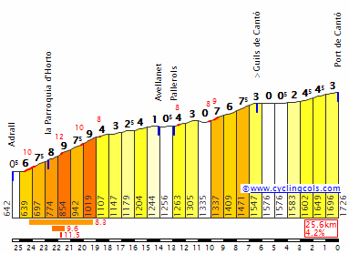 Port de Canto is 24.3km at 4.5%, with a maximum of 12%. After a 20km descent, the riders tackle Alt de Enviny. It is “only” a cat 1 climb, 8km at 6.8%, with a maximum of 12%. The final climb of the day, Port Aine, is 18.5km at 6.8%, with a maximum of 12%.