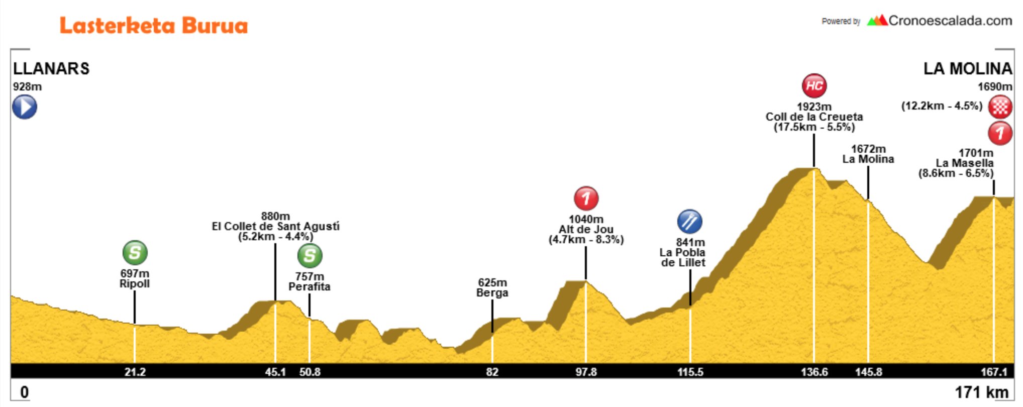 Como nada sucederá hasta el cierre, enfocaremos el análisis en el pico previo a La Molina. Se trata de La Masella, que consiste en 8.3 km al 6.4%. La parte más dura son los últimos 5 km, aunque nada que complique a los escaladores. Un breve descenso dará paso a la definición cuesta arriba en La Molina.