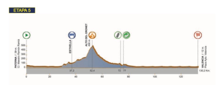 The cat 3 climb, Alto del Oronet, is 5.8km at 4.7%. Not overly difficult, but it can split the bunch if taken fast. After that we have a descent, before the lap circuit in Valencia.