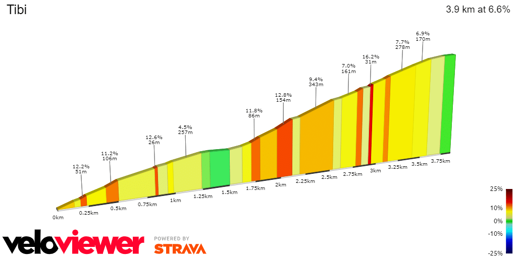 Con solo 16 kilómetros para el final, los ciclistas se enfrentarán a una colina cerca de la ciudad de Tibi. La batalla por el posicionamiento ya estará presente en la cima. Luego viene una bajada corta pero rápida. Una rampa pronunciada lleva a los ciclistas al sprint intermedio en el centro de la ciudad, y luego otro descenso rápido deja a los ciclistas en la base de la subida final.