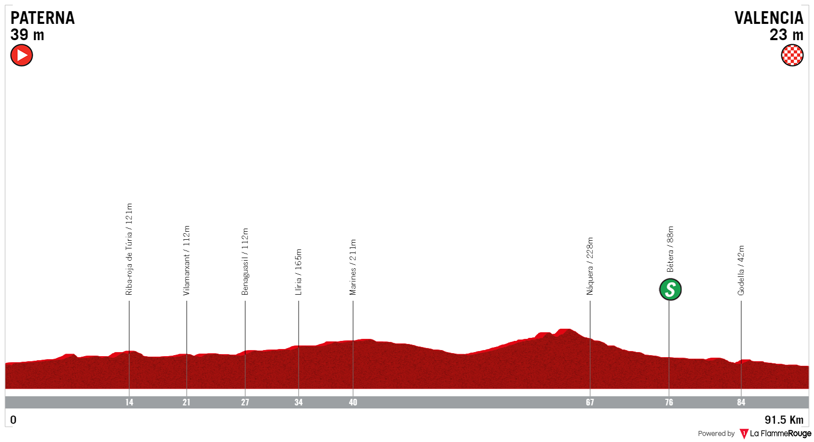 La etapa final comienza en las afueras de Valencia y hace un pequeño bucle hasta volver a la gran ciudad. No hay que llenar el tanque, este último día solo tiene 91,5 kilómetros en el menú, lo que lo convierte en uno de los días de carrera más cortos y seguramente más rápidos del año (excluyendo las contrarreloj). Casi todo plano, sin subidas que deban tenerse en cuenta.