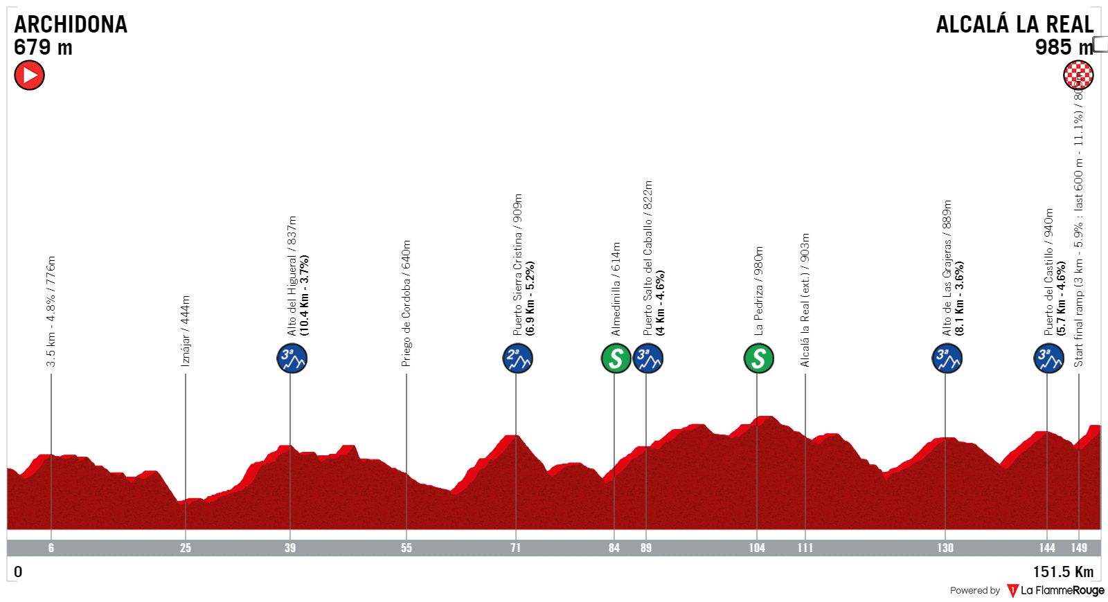 En Alcalá La Real, como algunas de las llegadas de la carrera, es una meta en lo alto de una pequeña localidad con un aspecto muy tradicional. Tiene 3 kilómetros de largo, pero se discutirá al final, ya que en los últimos 500 metros el camino se estrecha, el asfalto se convierte en el clásico pavimento rugoso y en los últimos cientos de metros cambia una vez más por adoquines. Final con muchas curvas, se espera un sprint entre los que han resistido y el posicionamiento será crucial.