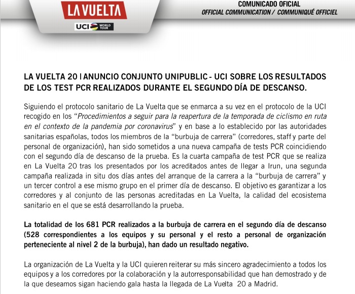 Unipublic, entidad organizadora de la Vuelta a España, emitió un comunicado en conjunto con la Unión Ciclista Internacional (UCI) acerca de los controles de coronavirus realizados en la segunda jornada de descanso. La última grande de la temporada continúa con su burbuja intacta, tras confirmarse que los 681 testeos resultaron negativos.