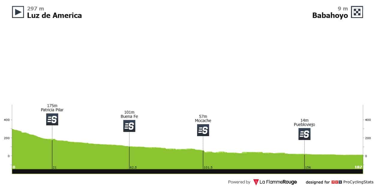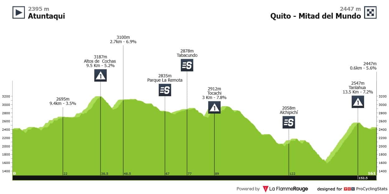 Una etapa con perfil bastante peculiar. Se partirá desde la localidad de Calacalí, cerca de Quito, y se descenderá durante casi toda la jornada hacia las llanuras cálidas y húmedas del litoral ecuatoriano. Ese larguísimo descenso no es muy complicado, pero si tiene en algunos puntos curvas cerradas a las que los corredores deberán poner atención. Las llegadas masivas no son muy comunes en las vueltas al Ecuador ya que las fugas suelen formarse y correr con mucho ímpetu y resultan difíciles de controlar sin embargo el hecho de que la mayor parte del día se vaya hacia abajo debería favorecer a la persecución que se haga desde el pelotón por parte de los equipos con rematadores, de entre los cuales destaca el CyS Technology por nombrar uno.