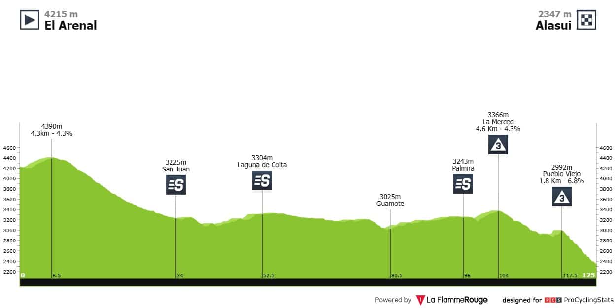 Una etapa corta y otra de perfil y condiciones peculiares. Lo primero que llama la atención de este recorrido es que los ciclistas partirán desde los 4200 metros sobre el nivel del mar en la zona de El Arenal, donde impera un clima muy frío. La Vuelta deja atrás la Costa para regresar a la región andina y lo hace en la zona de mayor altitud por lo que buena parte de la etapa se correrá por encima de los 3000 msnm, algo impensable en Europa y que a los ciclistas extranjeros menos acostumbrados a la altura les puede pesar mucho. La partida y los primeros kilómetros transcurrirán a los pies del nevado Chimborazo, la montaña más alta del Ecuador, un escenario inmejorable por lo portentoso de sus paisajes.