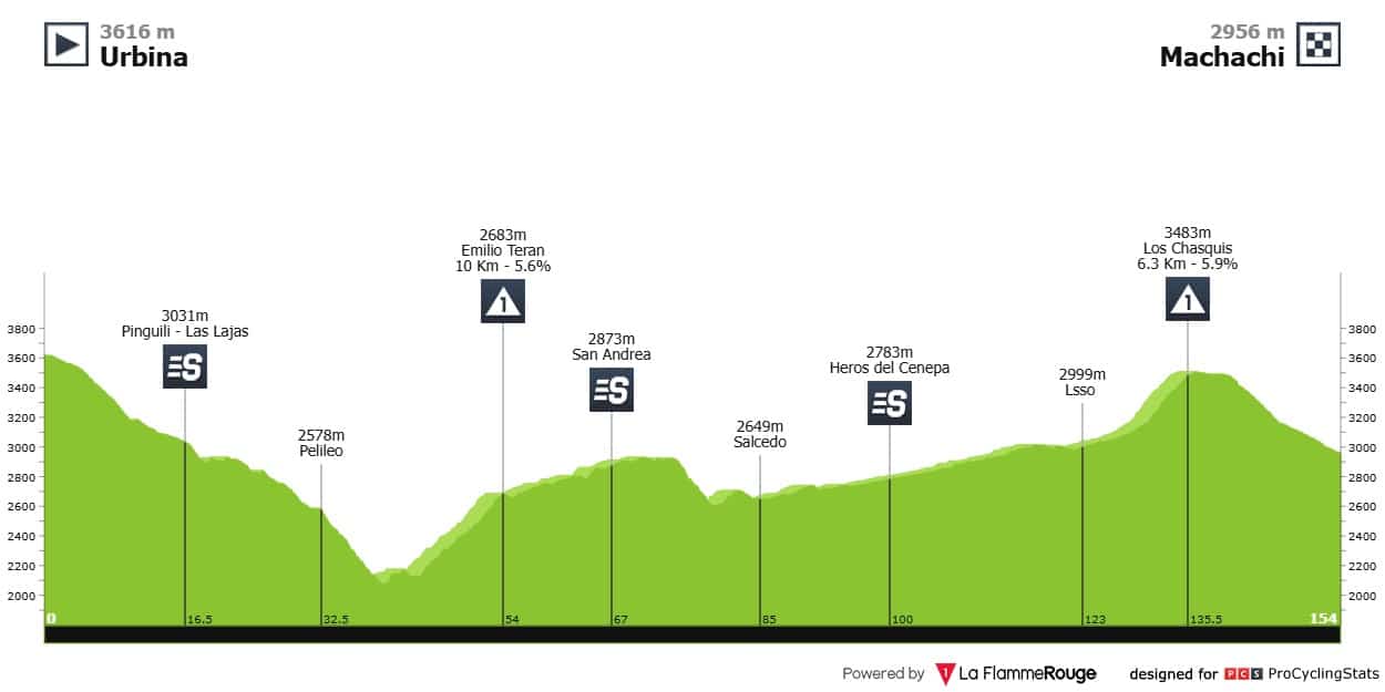 En este día comienza el tríptico montañoso que definirá la general de la Vuelta al Ecuador. Esta jornada es, en comparación a las siguientes, la más accesible pero no es nada sencilla. Se parte de nuevo desde las faldas del Chimborazo, esta vez a 3600 msnm desde la estación de tren de Urbina, pero esta vez se pone rumbo hacia el norte. Tras un largo descenso la carretera se pone cuesta arriba en el puerto de 1ra de Emilio Terán, de 10 km de longitud y primer puerto de entidad de la carrera en la que muchos corredores ya comenzarán a sufrir. A partir de aquí el pelotón atravesará una zona de carreteras de segundo orden estrechas y serpenteantes, casi siempre picando hacia arriba, hasta llegar al pie del segundo puerto del día: Los Chasquis, en que se regresa a la carretera principal. El descenso final desde esta última cima hasta Machachi será en carretera ancha así que no debería haber riesgo. Será un día de frío y de mucho sufrimiento para los corredores menos escaladores.