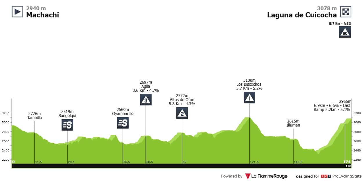 El único final en alto de la edición 2024 y será en un puerto inédito en la competencia: la Laguna de Cuicocha: un ascenso de 16 km de longitud en el que el tramo más exigente será entre los 10 a los 4 km a meta. Continuamos en altitudes intimidantes ya que el final de la tapa estará por encima de los 3000 msnm. La laguna es una de las maravillas naturales de esta zona del Ecuador y pondrá el escenario perfecto para lo que será una primera batalla decisiva entre los hombres de la general, el pelotón posiblemente llegue ya reducido al pie de este puerto final después de travesar más de 150 km de terreno ondulado y puertos de paso. El poderío de los equipos profesionales como Medellín, Banco de Guayaquil y Movistar-BestPC tendrá que desplegarse en esta tapa para asegurar que no haya movimientos peligrosos antes de Cuicocha.