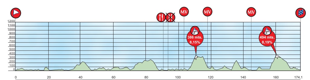 La primera trepada es Sollube, con 3,5 km finales a casi el 9%, donde se producirá la primera selección. Luego viene una subida sin categorizar que esconde 2,7 km al 8.6%.