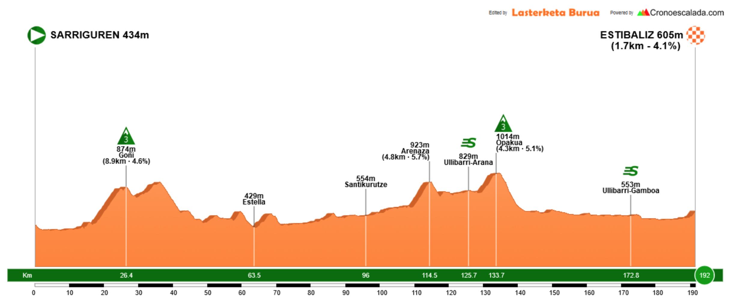 Sin sprinters presentes, no hay que conjeturar respecto a si sobrevivirán o no. Ciertamente que no es un parcial fácil, puesto que esconde 2800 m de desnivel acumulado. Eso sí, los últimos 60 km son accesibles, incentivo para que el pelotón controle la escapada matutina de cara a un sprint.